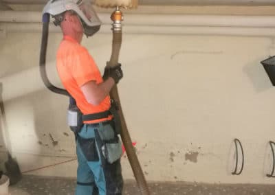 Der bores huller for ca hver meter i hvert bjælkefag. Hullerne lukkes efterfølgende med spartelmasse.